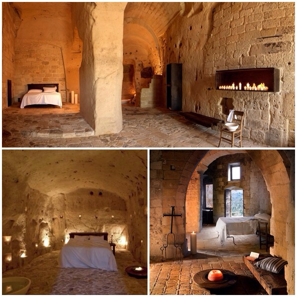 Sextantio Grotte della Civita – MateraBasilicata In un posto unico al mondo, i proprietari di questa meravigliosa struttura hanno voluto conservare l’autenticità dei famosi Sassi. Si dorme a lume di candela in camere di lusso ricavate nelle antiche grotte. I bagni, sistemati in nicchie e spesso con vasche a vista al centro della stanza sono una delle particolarità di questo hotel spettacolare.